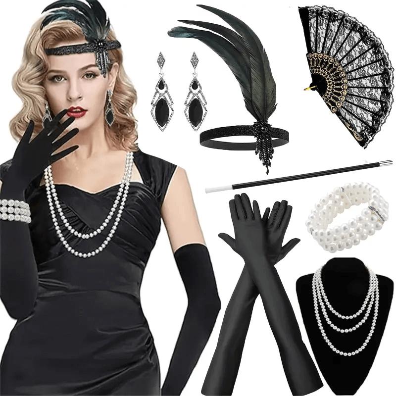 ## Набор Гетсби (9 предм.), Гангстерский к костюму ретро 1920-е гг. Код 08919/ 081062 Определимся, что входит в данный карнавальный комплект: 1. Головной убор с перьями и диадемой по центру (1 предмет) 2. Длинные черные перчатки (2 предмета) 3. Стильный ажурный веер (1 предмет) 4. Трёхрядный браслет из крупного жемчуга (1 предмет) 5. Четырёхрядное ожерелье - бусы из жемчуга (1 предмет) 6. Длинный 32-сантиметровый мундштук в стиле ретро (1 предмет) 7. Длинные эффектные серьги в гангстерском дизайне, крепятся на клипсах (2 предмета) Все размеры входящих в состав комплекта аксессуаров вы можете видеть на одном из фото, предлагаемых вашему вниманию. Этот набор аксессуаров на 100% решит вопрос полноценности и законченности вашего косплей образа на вечеринке Гангстеров или на Итальянской вечеринке или… просто на новогоднем корпоративе. Ведь всё, что вам нужно, кроме настоящего набора, – это подобрать какое-то плюс-минус подходящее платье из вашего гардероба или взять такое платье напрокат у хорошей подруги…)