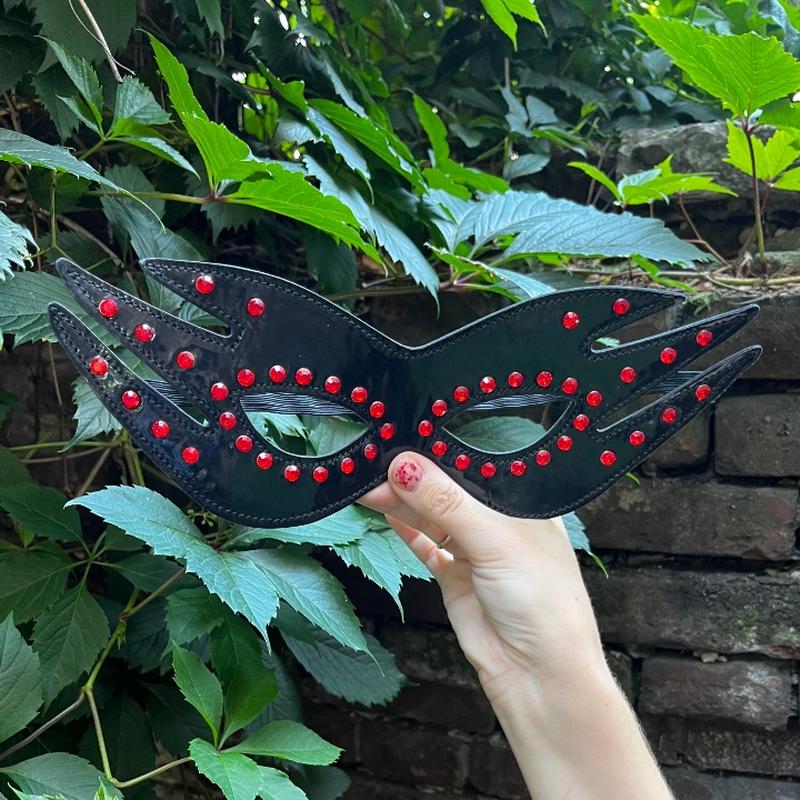 Маска женская кожаная чёрная и красная, карнавальная, лакировка и матовая с камнями.