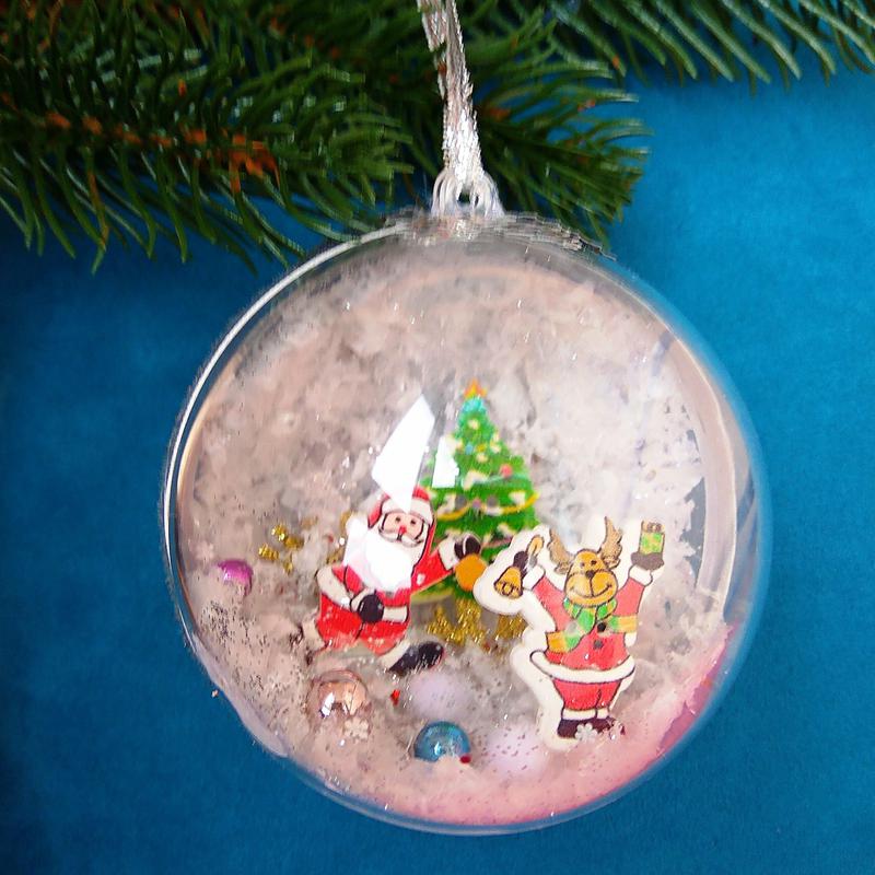 Основа игрушки: пластиковый шар. Шар украшен: искусственный снег, фигурки из дерева, пайетки, бусины. Размер: диаметр 8 см. Отличное украшение для Вашей ёлочки!