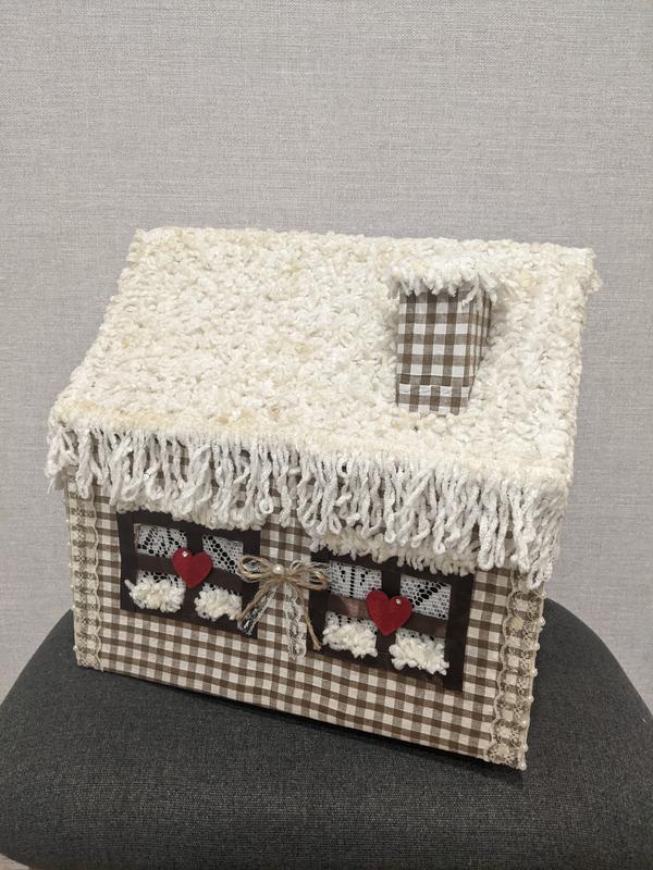 Продам новогодний домик в очень хорошем состоянии. Основа картон + текстиль. Внутри домика можно использовать гирлянду. Ручная работа.