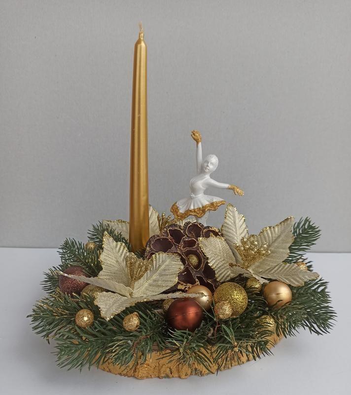 Новогодняя композиция со свечей на стол. Выполнена в древесине, срезе 21 см. С искусственной елкой. Задекорирован золотистыми пуансетиями, шариками, лотосом и главной фигурой выступает балерина Стоимость со свечей составляет 450 грн