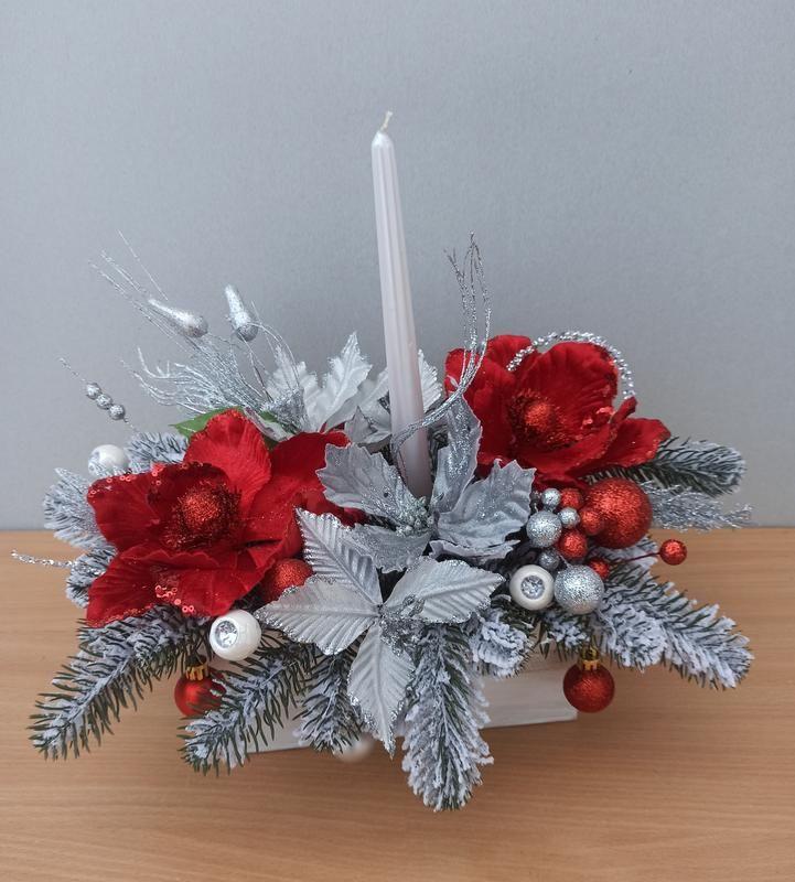 Яркая и блестящая новогодняя композиция со свечей на стол Выполнена в древесине<unk> яном кашпо длиной 22 см. Использована заснеженная искусственная елка. Очаровательные красные магнолии и серебряные пуансетии. Конечно новогодние шарики и ягоды и много блеска. С хвоей длина 32 см