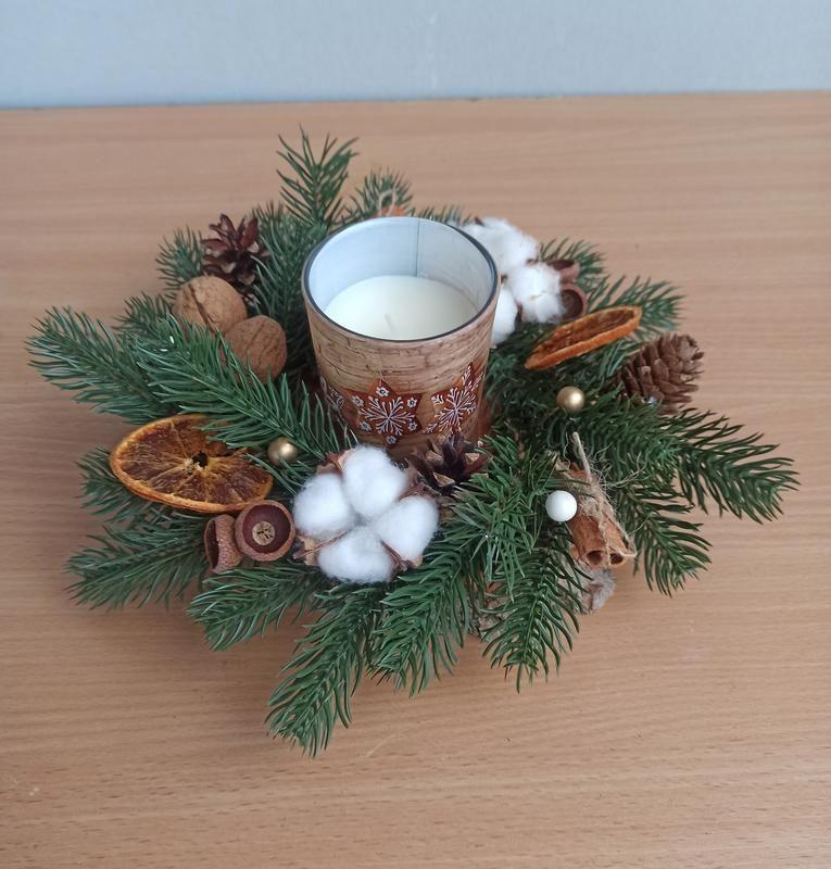 Поздравляю!. Предлагаю Вам нюдовую с белым и очень пряную рождественскую и и новогоднюю композицию на стол. Рождественская свеча к празднику. Очень красиво сочетаются все теплые элементы декора: хлопок, корица, орехи, шишки и сушеные апельсины Выполнена к тому же на срезе дерева 15 см. С искусственной елкой имеет 20-21 см Свеча имеет очень приятный аромат и кроме того в стакане с тематическим декором