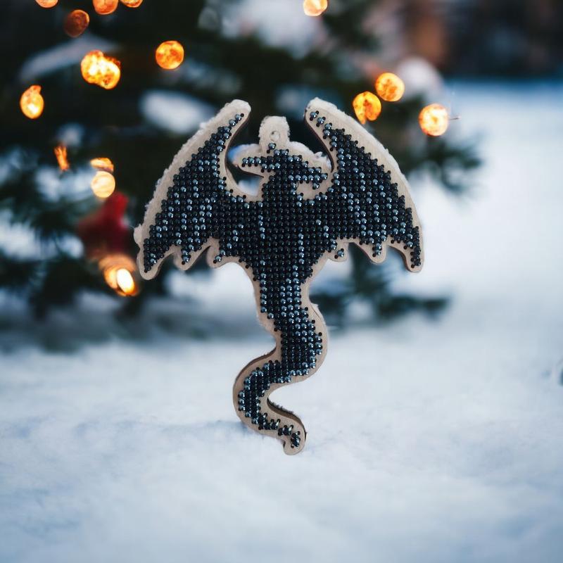 Елочная игрушка "Черный дракон" цена актуальна к концу ноября выполнено из фанеры и вышит бисером размер 9×11 см