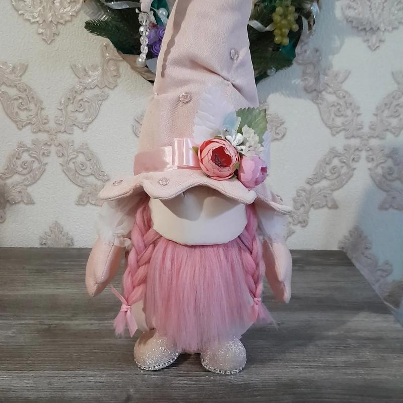 Скандинавский гном Рост60см.Сшит из жакардовой ткани покрытой вышитым фатином. Колпак и поля укреплены флористической проволкой. Наполнитель холлофайбер. Упаковка фатин.