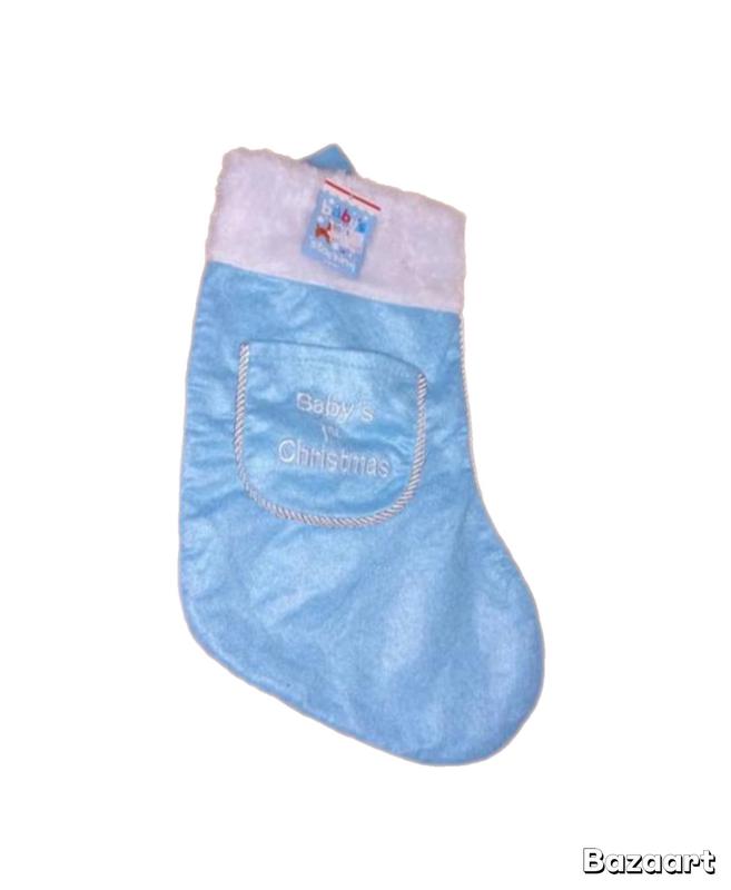 Сапожок из однотонной фетровой ткани с отделкой из искусственного меха. Отделка атласным шнуром по краю и карману. Вышита надпись «Первое Рождество ребенка». Петля для подвешивания ленты. Около 38см в длину.