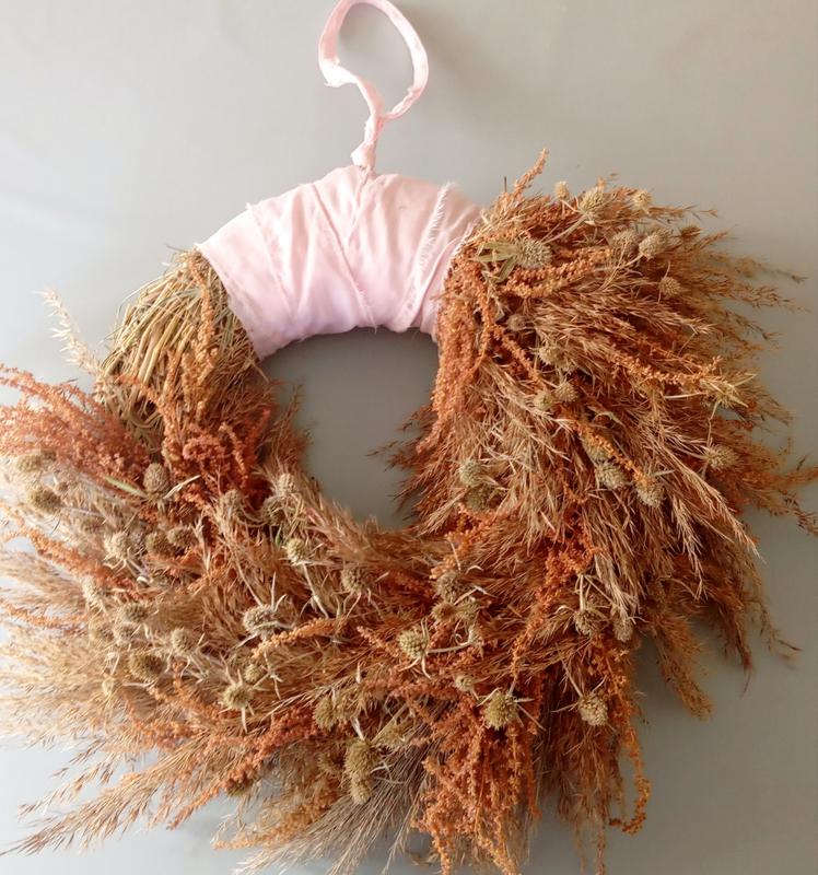 Декоративный осенний венок ручной работы. Выполнен из природных материалов на основе из соломы. Использованные материалы: тростник, астильба и эрингиум. Диаметр основания венка 28 см. Диаметр в самом широком месте в расправленном виде 50см.
