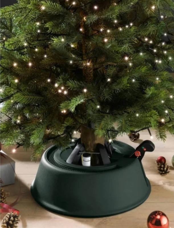 подставка для елки Livarno Home. Подходит для деревьев высотой до 2,5 м с диаметром ствола от 3 до 12 см. Имеет резервуар для воды объемом 2,5 л с индикатором уровня воды и защитой от перелива. Замок фиксируется и освобождается с помощью ножной педали, а механизм автоматически адаптируется к любой форме ствола.