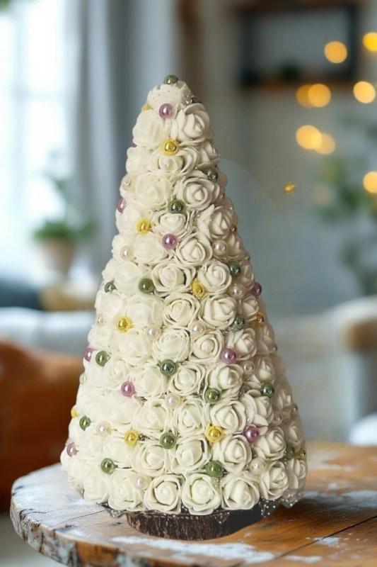 Маленькая оригинальная новогодняя елка ручной работы - отличный вариант для подарка или праздничного декора. Подойдет для украшения рабочего или домашнего стола. Елка украшена белыми фоаминовыми цветочками и разноцветными элементами. Высота - 16 см. Есть в наличии