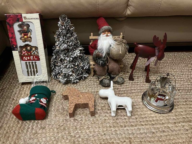 1) Дед Мороз Санта Клаус на скамейке цена 1200 грн 2) Железный олень цена 650 грн 3) Белый керамический олень – цена 650 грн 4) Пробковый олень цена 650 грн 5) Сапог-носочки для подарков – 300 грн 6) Большой зеленый мешок для подарков 80 на 50 см -цена 250 грн 7) Серебряная металлическая вазочка для декора -цена 300 грн 8) Елка из шишек – цена 500 грн 9) Новый набор елочных игрушек – цена 300 грн 10) еще есть рождественский большой венок из шишек