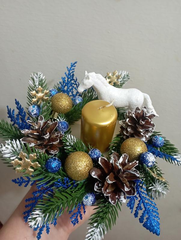 Новогодняя композиция с свечей и символом нового года лошадь, рождественская композиция, н...