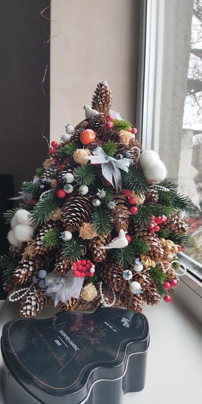 Елка декор для украшения дома. Отлично придает праздничное настроение. Украшена герляндой, которая работает в различных режимах. Высота самой елки 38 см + 5 см базируется