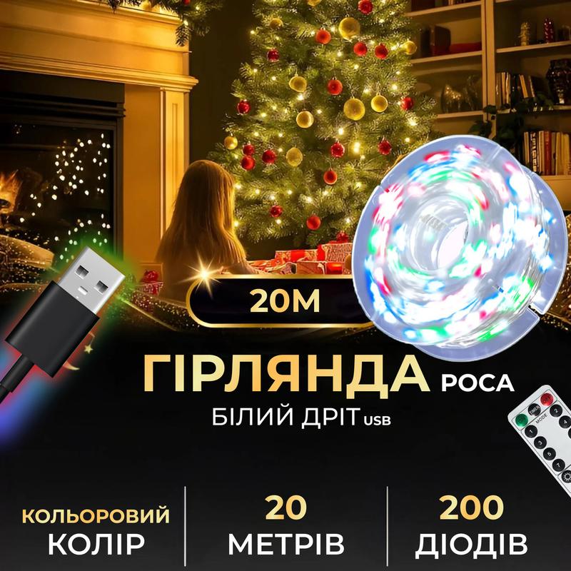 Гирлянда роса на пульте 20 метров usb на 200 led светодиодов капля белый провод мультиколо...