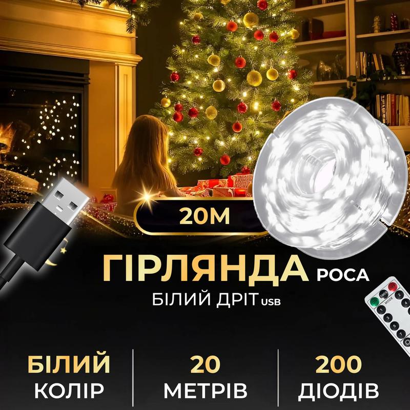 Гирлянда роса 20 метров usb на 200 led светодиодов капля белый провод белая