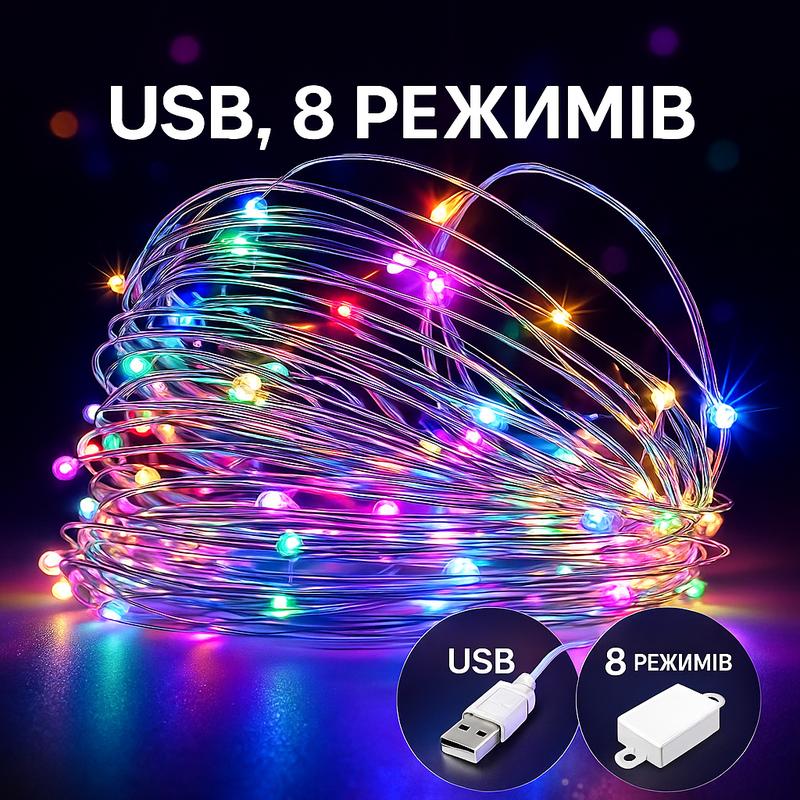 Светодиодная гирлянда «роса» 20 м, 200 ламп, мультиколор, 8 режимов, usb 5v + сеть 220 в