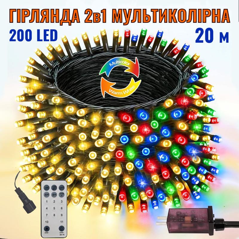 Светодиодная гирлянда 200 led, 20 м, ip44, теплый белый и мультиколор, зеленый провод, с п...
