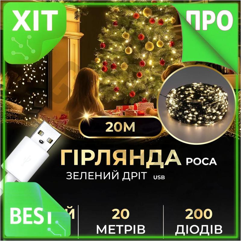 Ve гирлянда роса 20 метров new version usb 200 led светодиодная капля для декора елок и пр...