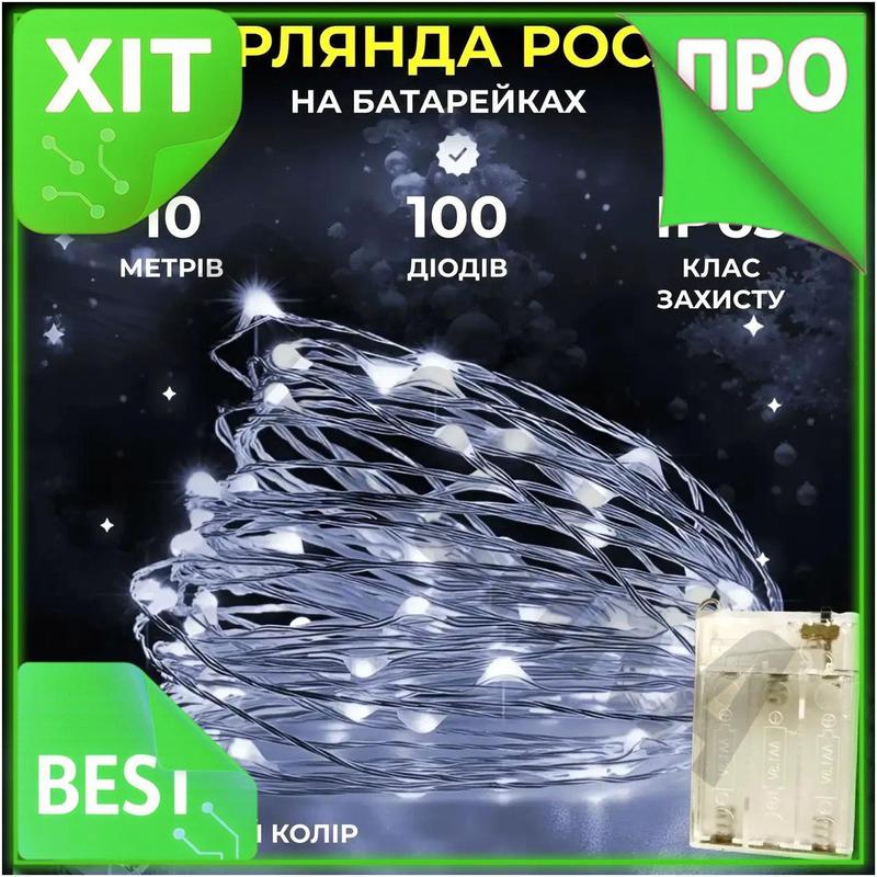 Ve гирлянда роса 10 метров new version 100 led на батарейках белая проволока для декора пр...
