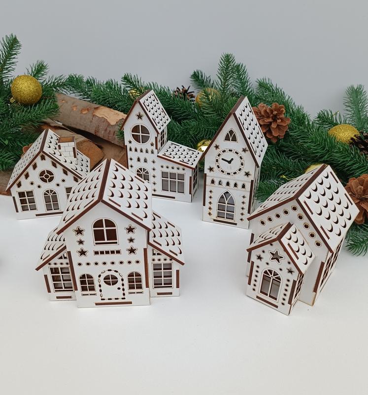 Колекція будиночків, 5 шт Розмір 10-15см Для створення святкової атмосфери всередину кожного будиночка ставимо електронну свічку. Використовуємо будиночки для декорування у своїх композиціях з хвої та куль. Підійдуть для затишного оформлення підвіконня, тумб, камінів, під ялинку, на кухню, дитячу кімнату та будь куди загалом. Також будиночки можна придбати кожен окремо, шукайте позиції на нашому сайті.