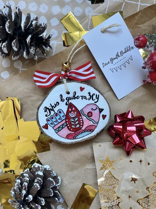 Деревянный спил с колокольчиком на ленте. Рисунок акриловыми красками. Каждый спил в едином экземпляре. Подарочная упаковка. Украшение можно вешать на елочку, или же использовать как декор на стену.