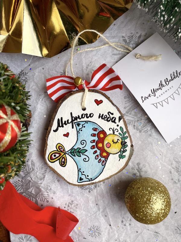 Деревʼяний спил з дзвіночком на стрічці. Малюнок акриловими фарбами. Кожен спил в єдиному екземплярі. Подарункова пакування. Прикрасу можна вішати на ялинку, або ж використовувати як декор на стіну. Дополнительные характеристики: Материал : Дерево
