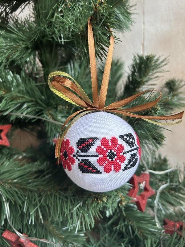 Хендмейд іграшка на ялинку власного виробництва, орнамент вишитий хрестиком з використанням ниток DMC. Розмір кульки 8 см в діаметрі.