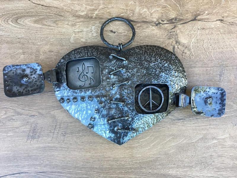 Ищете очень необычный подарок? Вы в нужном месте! Вот собственноручно кованое сердце с двумя окошками: слева - музыкальные знаки, справа - знак мира. Две детали сердца прошиваются иглой, а окна можно открывать и закрывать. Сердце имеет кольцо и может быть настенным декором в вашем доме. Размеры сердца: - Высота: 6 см - Длина: 32 см - Ширина: 22 см - Вес нетто: 1,5 кг Цвет: чистое железо, не окрашенное, лакированное. Это многофункциональное произведение искусства в индустриальном стиле. Хороший подарок на годовщину свадьбы (6-е - железо, 11-е - сталь), для молодоженов, на день рождения или как декор для дома.