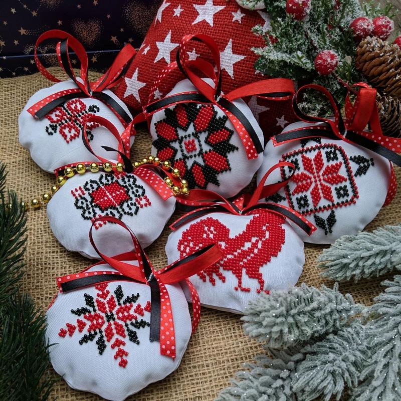 Ялинкові прикраси в національному українському стилі вишиті чеським бісером Preciosa Ornela. Повністю готові, охайне пошиття та вишивка. Використані стійкі відтінки бісеру, які не втрачають кольору при пранні. Можна прикрашати як ялинку так і для декору будинку або на подарунок. Тканина іграшок - габардин. Підвіска - атласна стрічка. Наповнювач - синтепон. Діаметр кожної - 10 см. Кількість в наборі - 6 шт Також можна придбати такі пошиті іграшки під самостійну вишивку бісером або нитками.