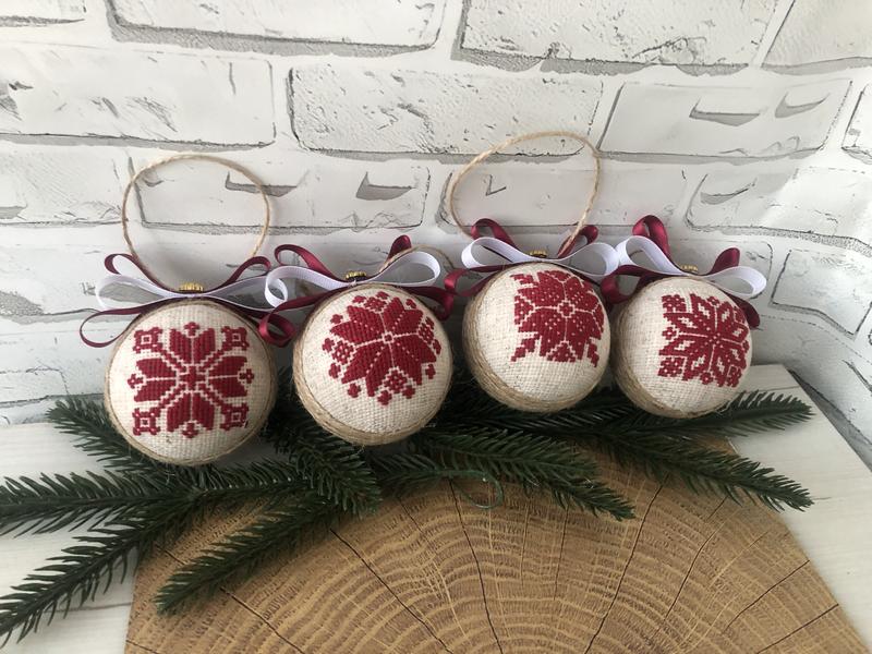 Набір складається з 4 куль, їх висота 6 см. Вишивка ручної роботи, вишито з однієї сторіни. На усіх кульках вишита восьмикутна зірка, що утворюється накладанням прямого хреста (чоловічого начала, Сонця) і косого хреста (жіноче начало, Місяць), то можна сміливо сказати, що восьмикутна зірка символізує початок всього життя на Землі і саму Природу. Тканина вишивальна кольору льону. Боки задекоровані лляною ниткою. Набір продається в коробці. Можливий продаж окремо від набору.