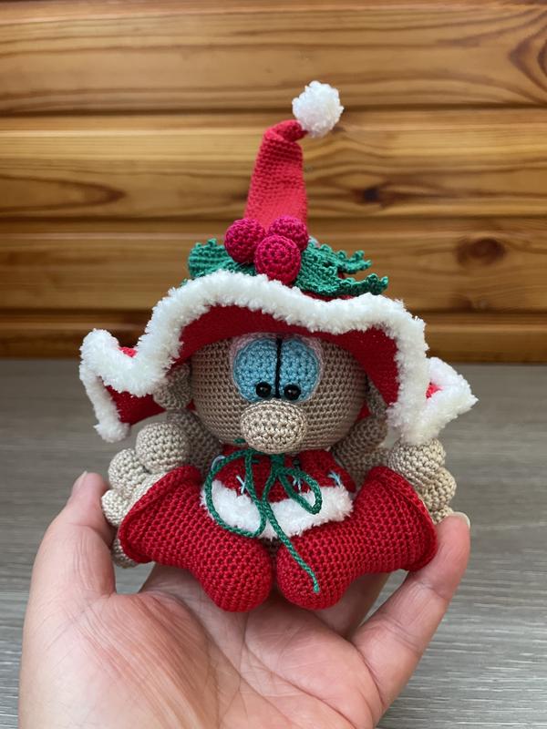 Звʼязаний гачком з бавовняних ниток, наповнений холлофайбером. Всі деталі пришиті. Висота з шапкою 17 см.
