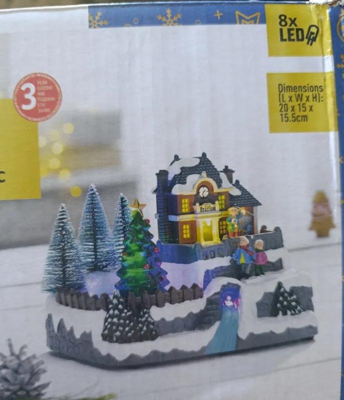 Новорічна світлодіодна декорація, яка створює атмосферу зимового казкового містечка. Декорація оснащена 8 LED-лампами, які надають ефектне освітлення. Розміри декорації: 20 x 15 x 15,5 см. Прикрасить ваш дім та створить святковий настрій. Новорічна інсталяція. Це анімована різдвяна сцена LIVARNO home з LED-підсвічуванням та музикою. Має два режими один з музикою інший без музики. Ялинка обертається. Вона призначена для використання в приміщенні та має такі особливості: Різнокольорові вогники Вбудований 6-годинний таймер