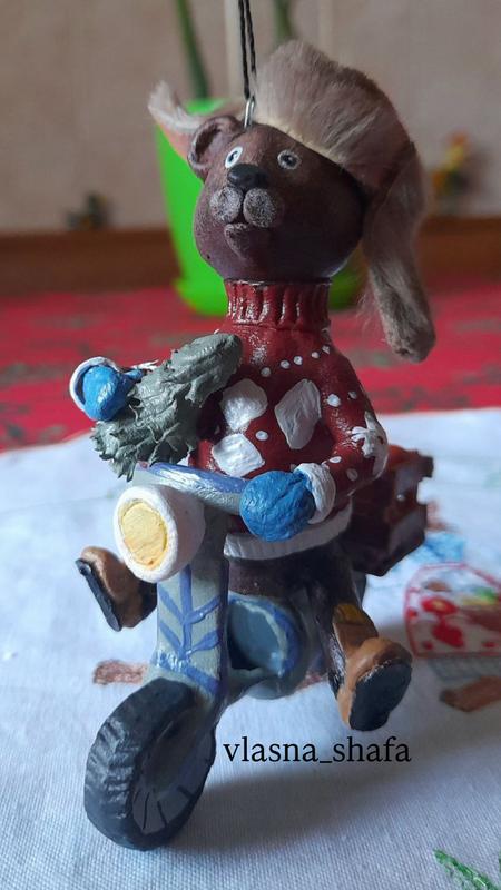 Ялинкова іграшка прикраса у вигляді кумедного ведмедика на мопеді з ялинкою в руках