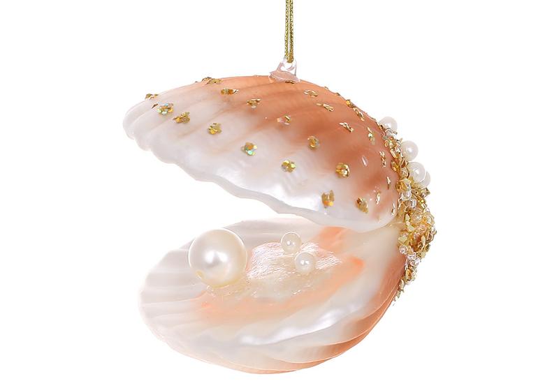 Ялинкова прикраса зі скла мушля з перлиною та бісером 7.5см, колір - перламутровий теракот