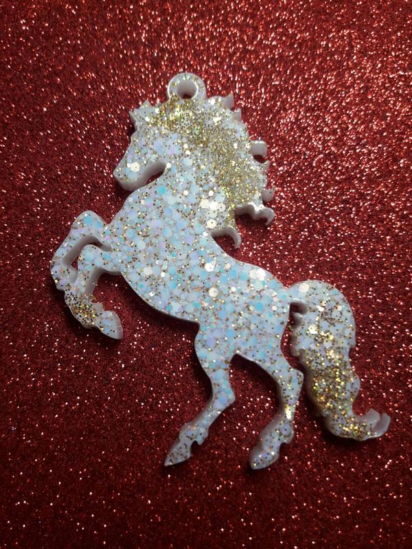 Эта изящная лошадь станет прекрасным украшением для вашей елки. Изготовлен из эпоксидной смолы. Насыщенный радужными и голографическими глиттерами, фантастически переливающимися на свету.