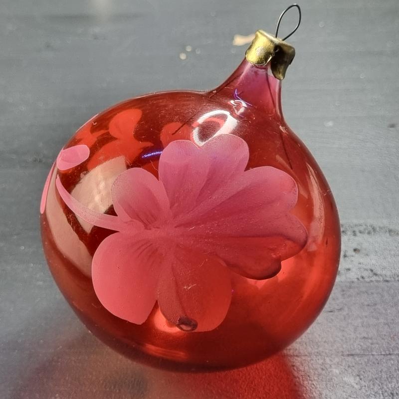 Просьба через кнопку КУПИТЬ заказ НЕ ОФОРМЛЮВАТЬ🪐 Отправка осуществляется после полной оплаты на карту. 📸 Описание: Красное стеклянное елочное украшение ручной работы, вероятно советского периода. Имеет грушевидную форму с узким горлышком и металлическим колпачком для подвешивания. Поверхность украшена розовым матовым цветочным орнаментом - один вариант с крупными лепестками, другой с мелкими листочками. Стекло прозрачное, блестящее, хорошо отражает свет. ⚠️ Дефекти: Металлический колпачок имеет следы окисления и потертости На стекле есть незначительные потертости, характерные для возраста