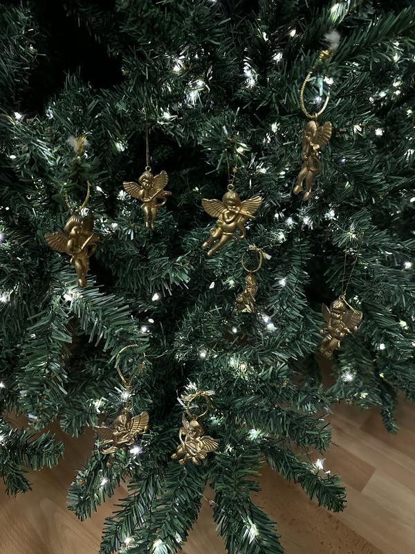 Набір із дев’ять золотистих ялинкових янголят з пластику розміром 5×6 см, кожне з детальним опрацюванням крилець і фігур та тонкою золотою підвіскою, яка гарно виглядає на зелених гілках і вогниках гірлянди. Стан ідеальний, без подряпин.