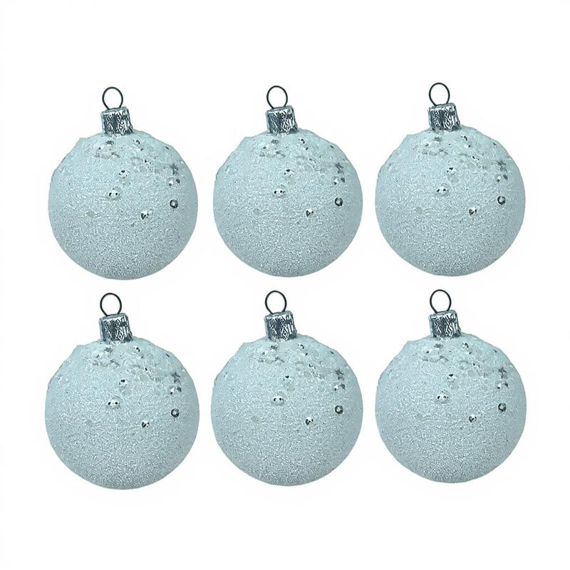 Набор из 6 новогодних шаров диаметром 8 см в белом цвете -- это универсальное украшение для создания светлого и нарядного праздничного декора. Глянцевая поверхность с мерцающим глиттером и небольшими звёздочками даёт мягкий сияющий эффект, который особенно красиво проявляется при освещении гирляндами. Такой дизайн легко вписывается как в традиционные новогодние палитры, так и в современные стильные сочетания, делая украшения удачным выбором для любой праздничной композиции. Шары выполнены из лёгкого и прочного пластика, благодаря чему они устойчивы к ударам и не повреждаются при случайных падениях. В верхней части каждого изделия предусмотрено крепление, позволяющее без труда закрепить украшение на ёлке или включить его в другие элементы праздничного декора. Основные характеристики набора новогодних шаров на елку: Количество: 6 штук; Материал: пластик; Крепление: металлическая петелька для подвешивания; Диаметр: 8 см. Благодаря удачному сочетанию цвета, размера и декоративного покрытия, набор подходит как для украшения небольшой ёлки, так и для создания объёмных праздничных композиций. Эти шары помогут сделать декор более насыщенным и гармоничным, добавив новогоднему убранству яркости и глубины.