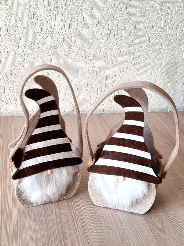 Святкова упаковка - сумочки з фетру для подарунка. Дуже смішний маленький милий гном у смугастій шапочці. Виготовлена з фетру, досить містка. У сумочку можна помістити подарунок , наприклад - пасок, шкарпетки , парфуми, косметику, ювелірну прикрасу та ін. Для дитини туди можна помістити цукерки , невелику іграшку, банку Nutella та всякі дрібниці. Сумочки можна підвісіти як декор , на ялинку, красиво декорувати будь де. Місткість: 700 гр - 1000 гр Розмір: висота із ручкою 23 см. Усередині 7 см . Висота самої сумочки до кінця ковпака 19 см . Ширина 10 см. Глибина 7 см. Ціна за набір. Нова. Країна виробник - Німетчина