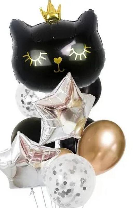 Набор из шариков Черная кошечка В набор входит: Фольгированная фигура Кошечка Принцесса с Короной черная 48 см x 55 см - 1 шт Фольгированная фигура Звезда Серебро 45 см - 2 шт Воздушный шарик с серебряным конфетти 30 см - 2 шт Латексный воздушный шарик бронза хром 25 см - 2 шт Латексный воздушный шарик черный 25 см - 3 шт Клеевые точки 40 шт