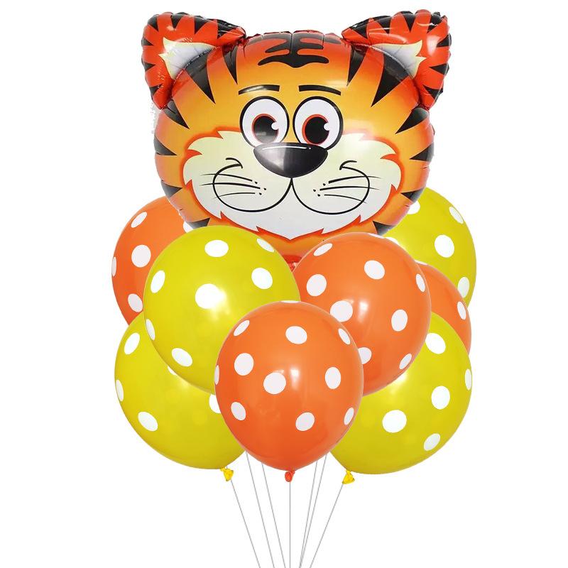 Фольгована фігура Тигрик із кульками в горошок У набір входить: Фольгована фігура голова Тигрик 30 см × 26 см - 1 шт Латексна повітряна куля помаранчева у юілий горох 30 см - 4 шт Латексна повітряна куля жовта у білий горох 30 см - 4 шт