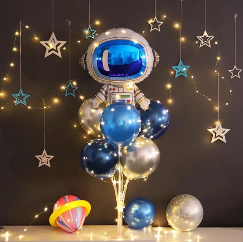 Космонавт на стойке для воздушных шаров с гирляндой В набор входит: Фольгированная фигура Космонавт 37 см × 29 см - 1 шт Латексный воздушный шар агат розовый 25 см - 1 шт Шар для моделирования желтая - 1 шт Латексный воздушный шар темно-синий металлик 25 см - 2 шт Латексный воздушный шар голубая металлик 25 см - 3 шт Латексный воздушный шар серебро металлик 25 см - 3 шт Стойка для воздушных шаров на 7 шаров высотой 70 см - 1 шт Гирлянда