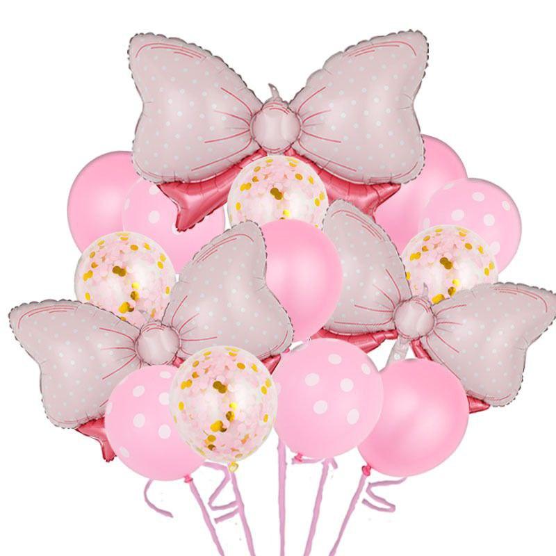 Набор воздушных шариков Розовые бантики В набор входит: Фольгированная воздушный шарик Бантик 38 см × 24 см - 3 шт Латексный воздушный шар розовый в белый горох 25 см - 4 шт Латексный воздушный шар розовый 25 см - 4 шт Латексный воздушный шар с золотым конфетти 30 см - 4 шт Клеевые точки 40 шт