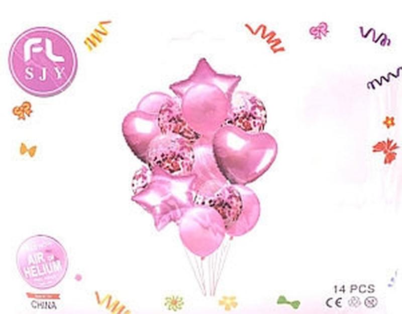 - 2 голубые звезды диаметром 18" - 2 сердца голубых диаметром 18" - 5 голубых латексных шариков диаметром 10" - 5 прозрачных латексных шаров диаметром 10" с конфетти кружочки