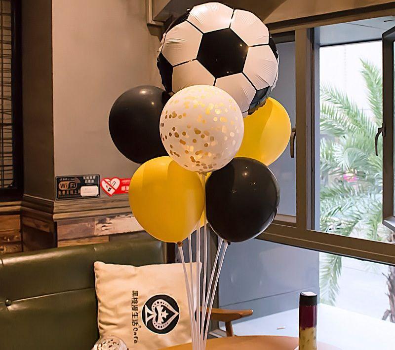 Фольгированный Футбольный мяч на стойке для воздушных шаров В набор входит: Фольгированная фигура Футбольный мяч 44 см × 44 см - 1 шт Латексный воздушный шар желтый 25 см - 3 шт Латексный воздушный шар черный 25 см - 3 шт Латексный воздушный шар с золотым конфетти 30 см - 3 шт Стойка для воздушных шариков на 7 шариков высотой 70 см - 1 шт
