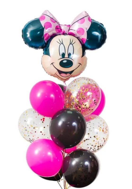 Набор воздушных шариков Минни Маус В набор входит: Фольгированная фигура Минни Маус 30 см × 30 см - 1 шт Латексный воздушный шар черный 25 см - 4 шт Латексный воздушный шар малиновая 25 см - 4 шт Латексный воздушный шар с золотым конфетти 30 см - 4 шт Клеевые точки 20 шт Лента 10 м