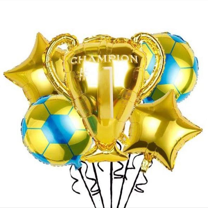 Набор воздушных шаров футбольный набору входить: Фольгированная фигура Кубок - 1 шт Фольгированная фигура Футбольный мяч желто-голубой 44 см × 44 см - 2 шт Фольгированная фигура Звезда золото 45 см × 45 см - 2 шт Клеевые точки 20 шт Лента 10 м