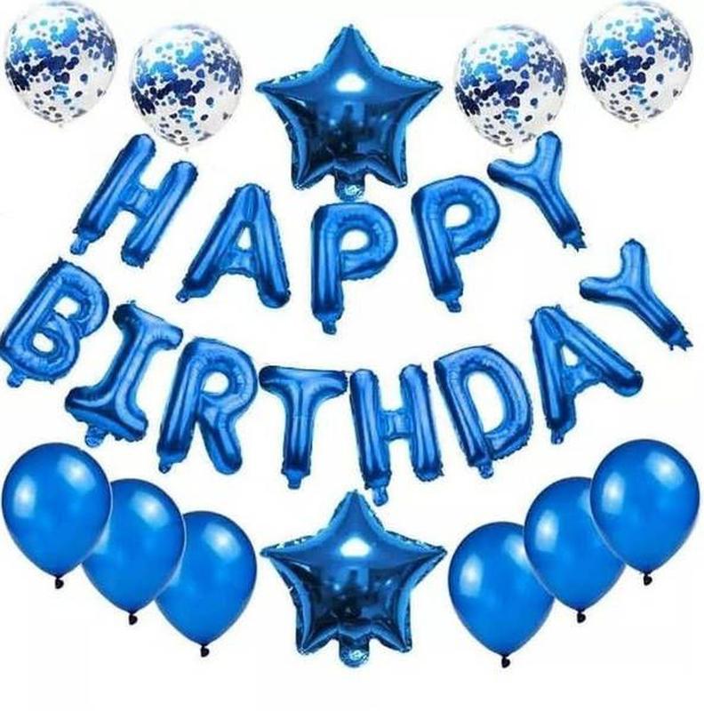 Набор воздушных шариков В набор входит: Фольгированная надпись Happy birthday синий - 1 шт Фольгированная фигура Звезда синяя 45 см × 45 см - 2 шт Латексный воздушный шар синий 25 см - 6 шт Латексный воздушный шар с синим конфетти 25 см - 4 шт Клеевые точки 20 шт