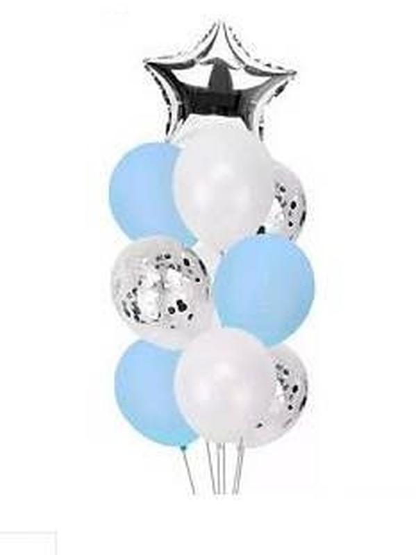 Фонтан воздушных шариков В набор входит: Фольгированная фигура Звезда серебро 45 см - 1 шт Латексный воздушный шар с серебряным конфетти 30 см - 3 шт Латексный воздушный шар белый 25 см - 3 шт Латексный воздушный шар голубой 25 см - 3 шт Лента 10 м
