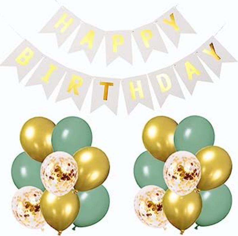 Набор воздушных шариков В набор входит: Бумажная надпись-гирлянда Happy birthday серебряный - 1 шт Латексный воздушный шар зеленая оливка 25 см - 6 шт Латексный воздушный шар хром золото 25 см - 6 шт Латексный воздушный шар с золотым конфетти 30 см - 4 шт Лента 10 м