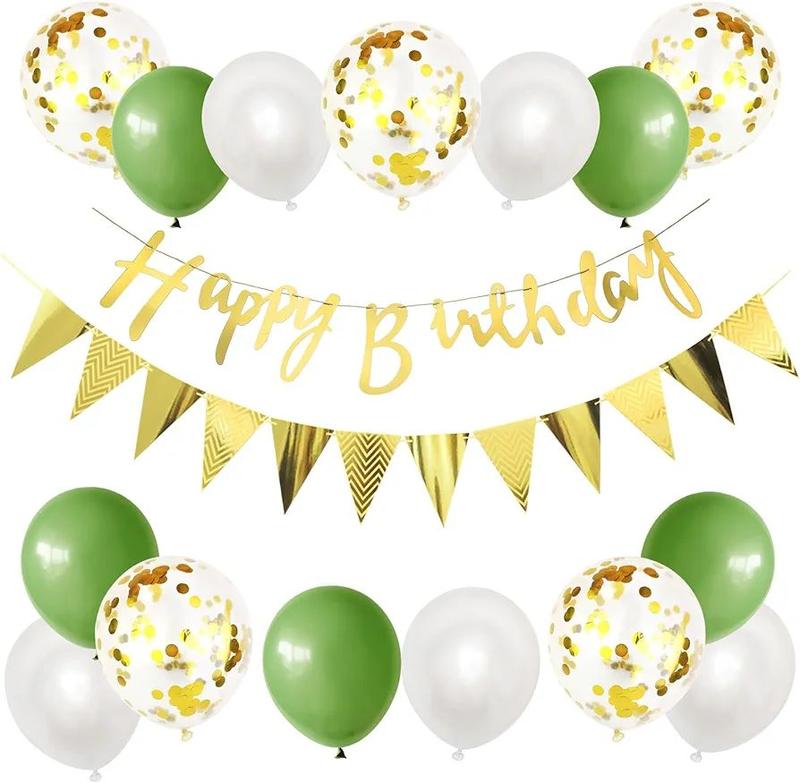 Набір повітряних кульок У набір входить: Картонний напис Happy birthday прописом золото - 1 шт Прапорці-трикутники золото - 1 шт Латексна повітряна куля біла 25 см - 5 шт Латексна повітряна куля салатова 25 см - 5 шт Латексна повітряна куля із золотим конфеті 30 см - 5 шт Клейові точки 20 шт Стрічка 10 м